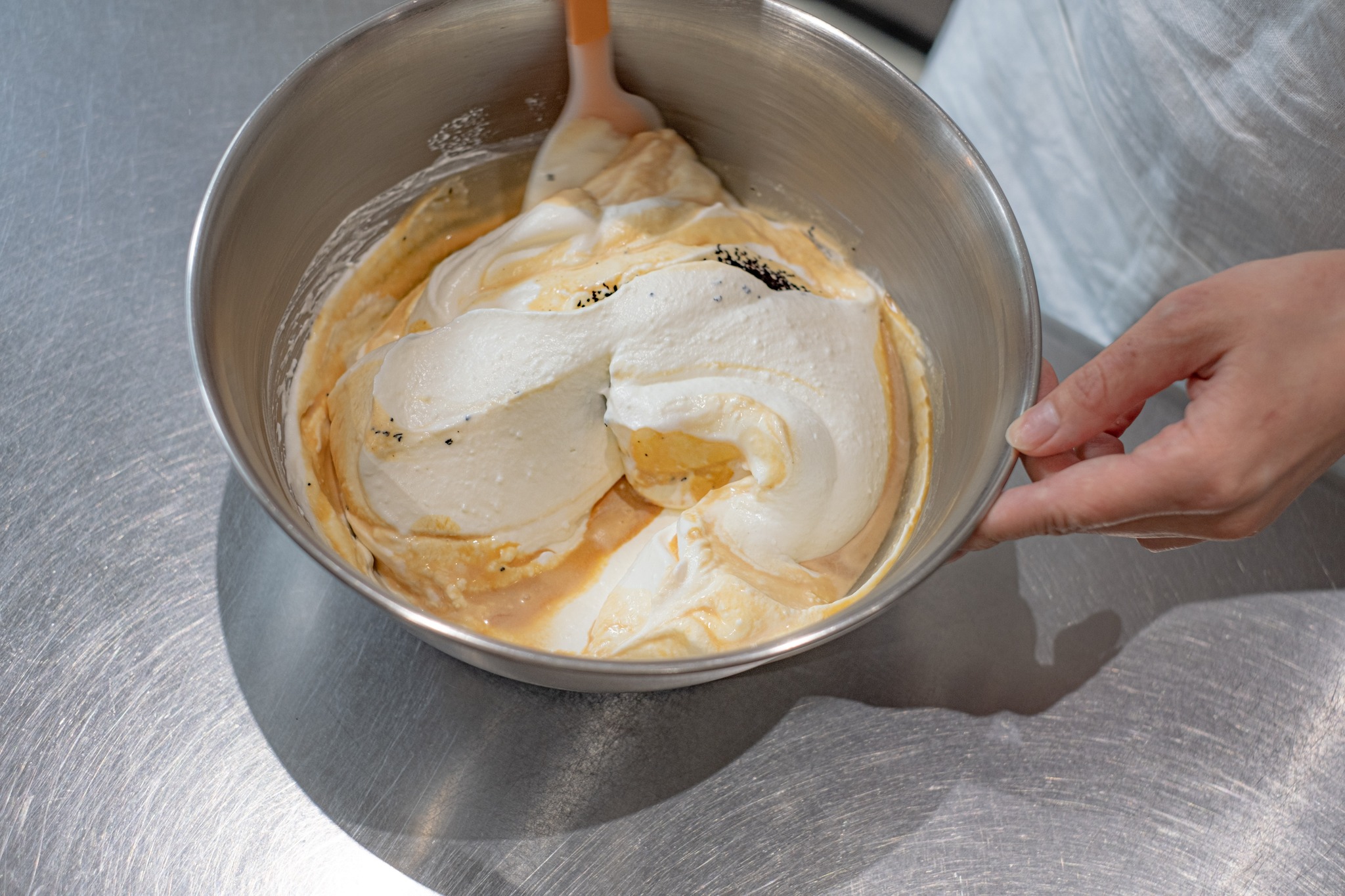 混ぜ合わせる具材のメインには、シロップ漬けの桃を。見た目も味わいも楽しいスイーツになるよう味の異なる2種類の桃(白桃・黄桃)を使うことに。たっぷり入った桃の果肉が、夏らしい爽やかさを演出します。